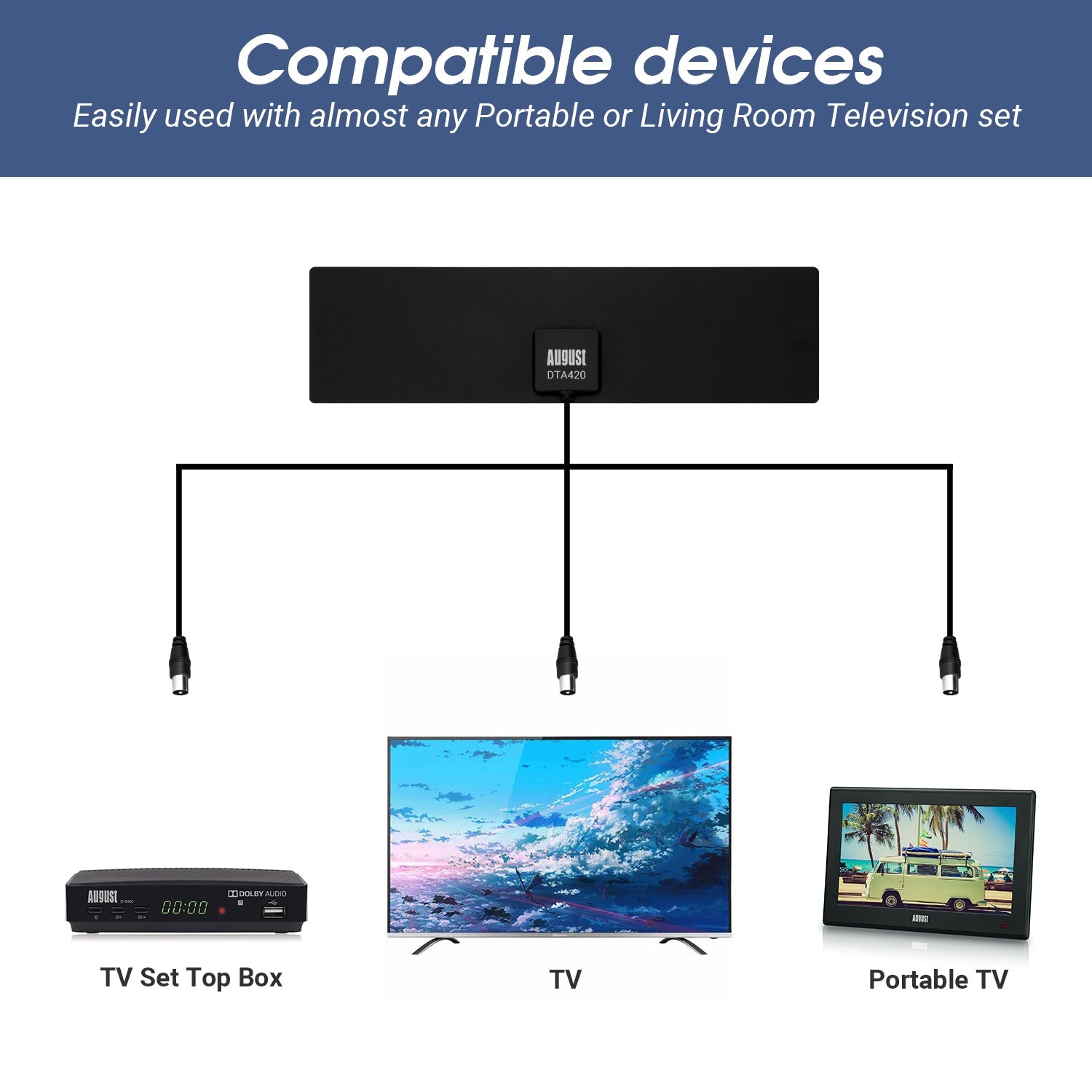 3m Koaxialkabel für eine einfache Platzierung der Antenne an der besten Stelle im Raum um den Fernseher herum. Kein zusätzliches Netzteil erforderlich.