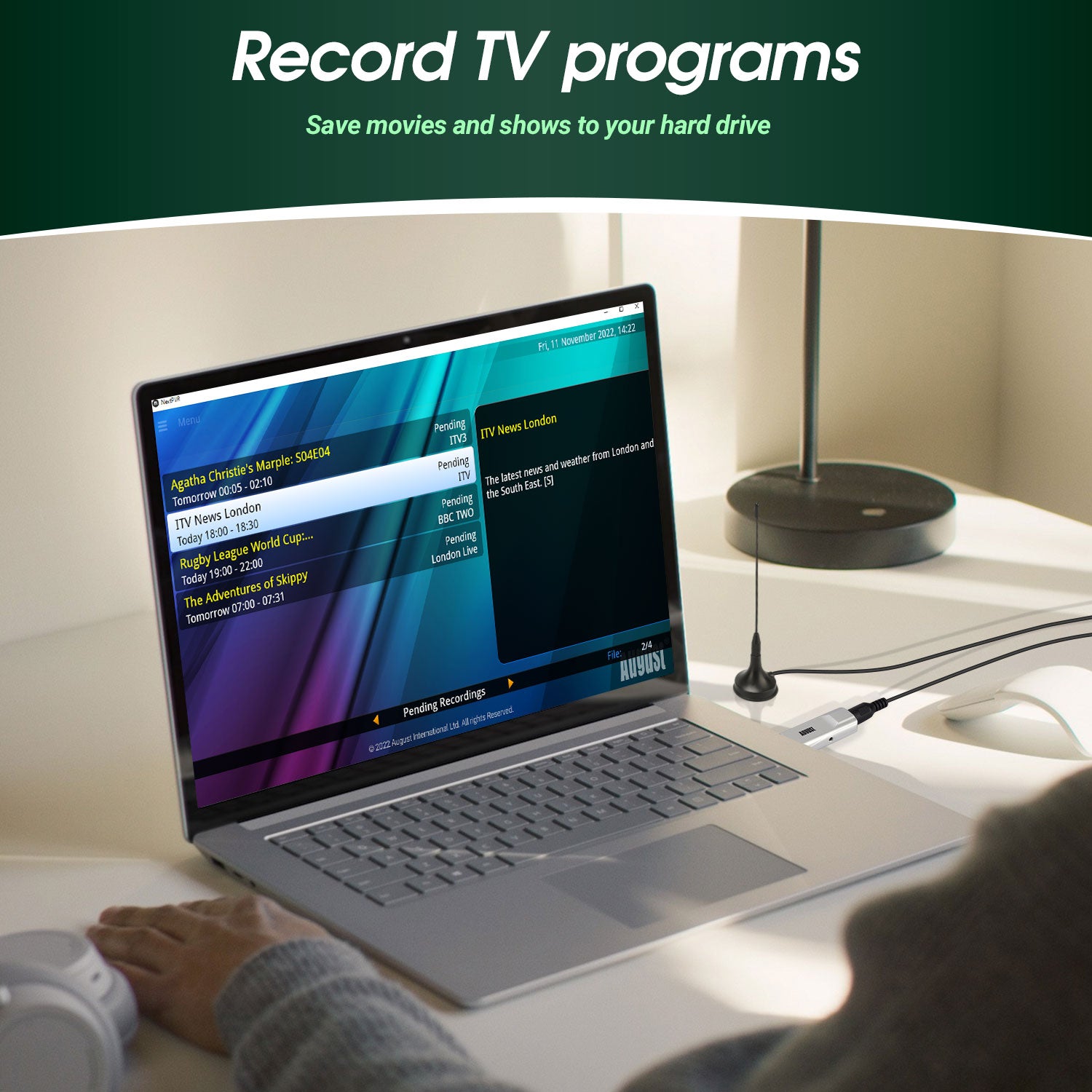 Der August DVB-T210 kann DVB-T2 Free-to-watch terrestrische Fernsehsender direkt auf Ihrem Laptop oder Desktop-PC empfangen, indem Sie eine kompatible Haus- oder Portable-Antenne in den Antenneneingang des Geräts stecken und das Gerät in einen USB-Anschluss Ihres PCs/Laptops einstecken.