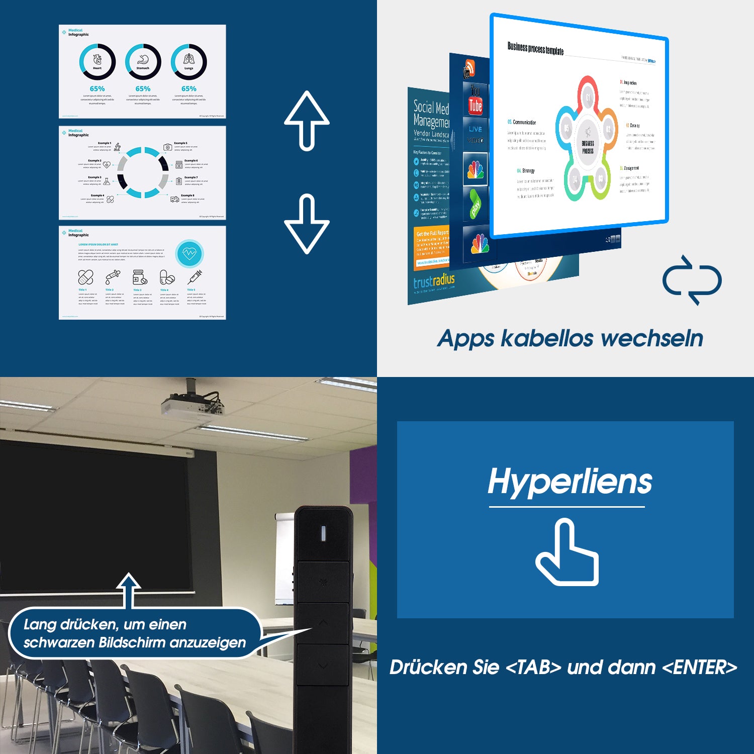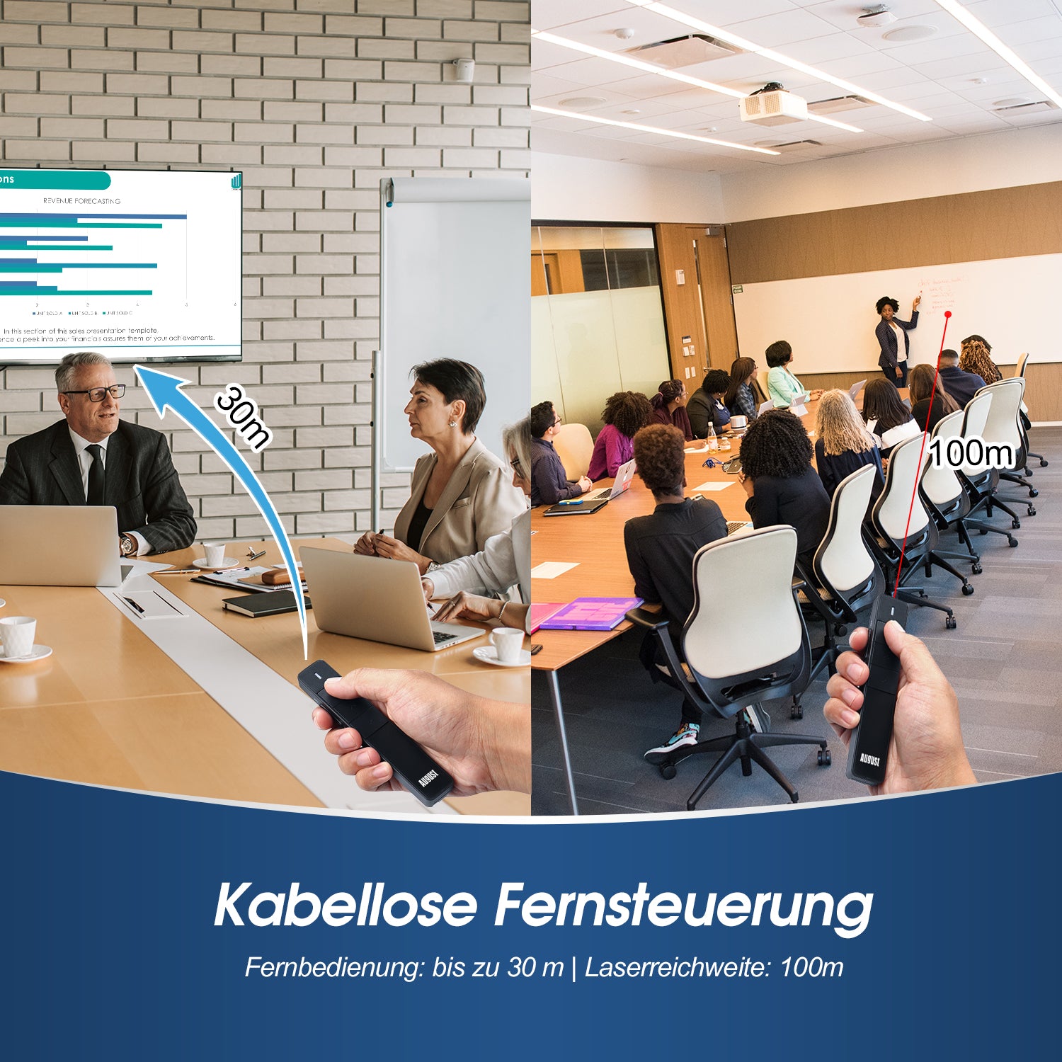 Klein und kompakt, lässt es sich leicht mit sich herumtragen, das ist es. Mit einer Reichweite von 30 Metern können Sie sich selbst in den größten Konferenzräumen bedenkenlos bewegen. Sie müssen sich also nie um die Stärke der Verbindung oder die Reichweite während Ihrer Präsentation sorgen, es kann fast alle Ihre Anforderungen erfüllen. Der Laser hat eine Reichweite von bis zu 200 Metern und kann Ihnen helfen, die Aufmerksamkeit Ihres Publikums auf die wichtigen Inhalte Ihrer Präsentation zu lenken.