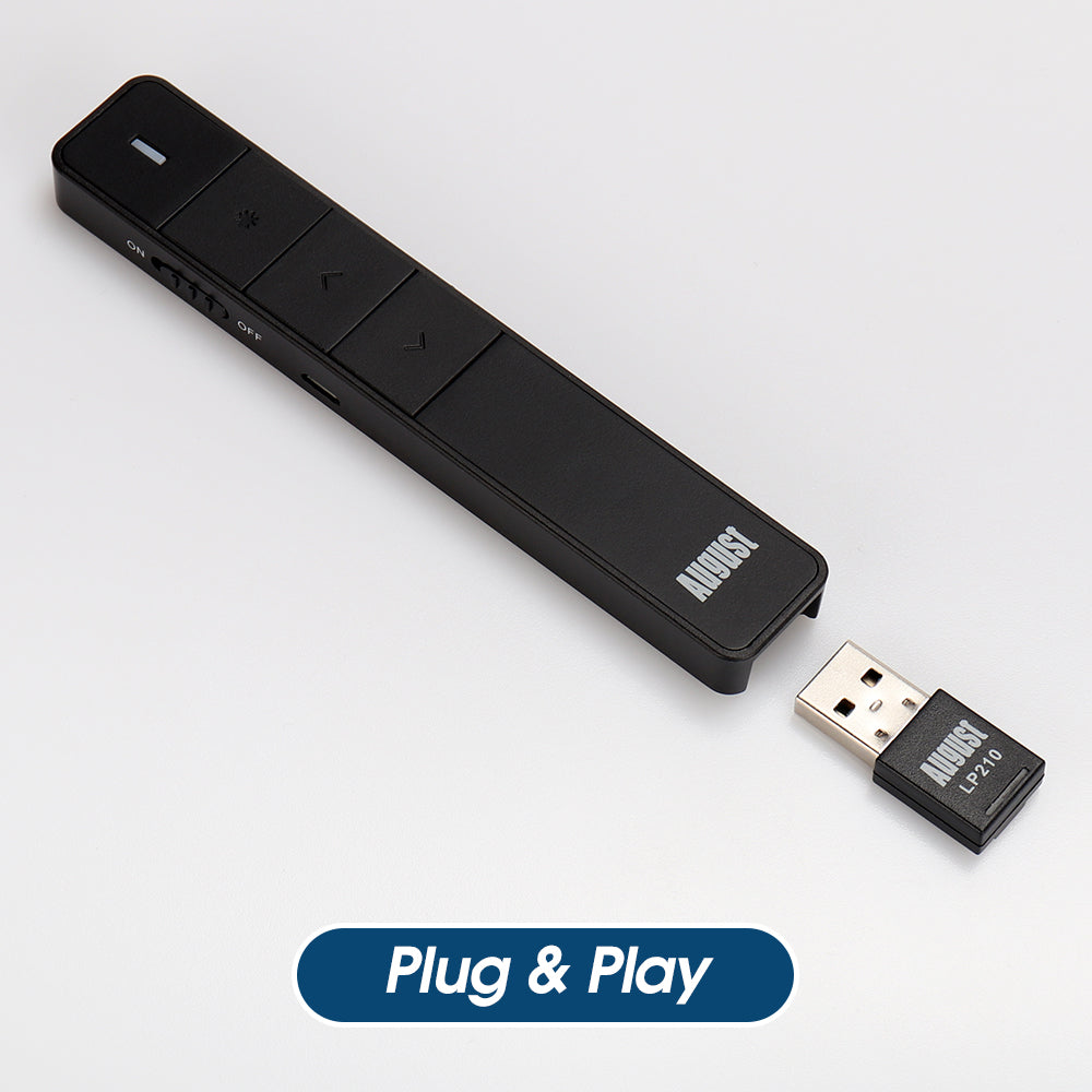 Verlieren Sie immer den kleinen USB-Dongle? Mit diesem August LP210 wird das nicht mehr passieren. Ohne Fragen zu stellen, können Sie den USB-Dongle aus dem Presenter nehmen und an Ihren Computer anschließen. Mit einfachstem Plug&Play startet die Präsentation sofort (keine Treiber oder Software erforderlich). Wenn Sie mit der Nutzung fertig sind, können Sie den USB-Dongle einfach wieder in den Presenter stecken und in die dafür vorgesehene Tasche legen.