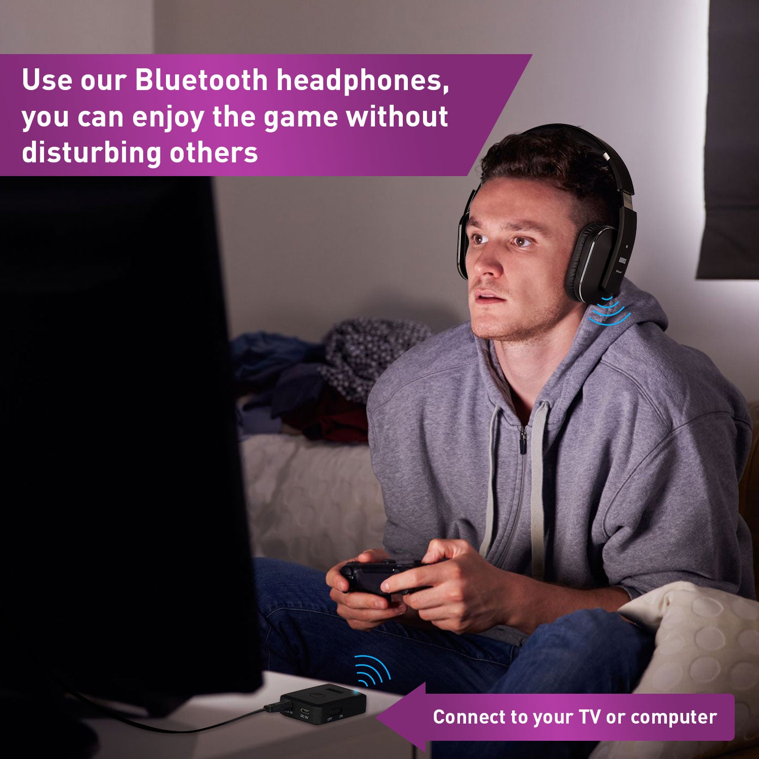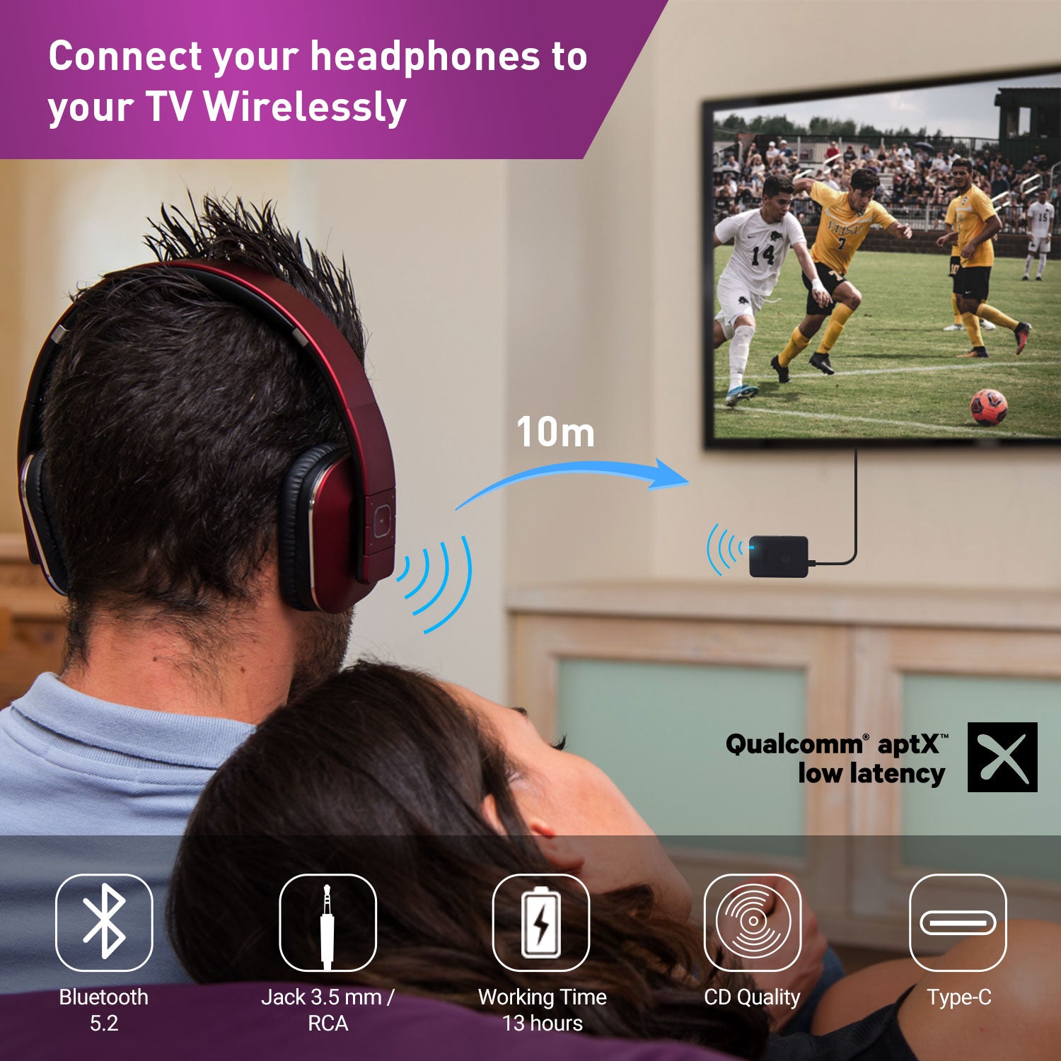 Erleben Sie nahtlose Audioübertragung mit dem August MR250 Bluetooth-Transmitter, der in der Lage ist, Audio von jeder verbundenen Quelle mithilfe der mitgelieferten 3,5-mm-AUX- oder Composite-Kabel direkt auf Ihre Bluetooth-Kopfhörer, Lautsprecher und mehr zu übertragen. Genießen Sie fernsehfreie TV-Unterhaltung, indem Sie den MR250 mit Ihrem Fernseher verbinden und Audio in Echtzeit mit dem Qualcomm AptX Low Latency-Codec an Ihre Bluetooth-Kopfhörer übertragen.